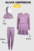 Satu set pakaian renang Muslimah berbahan dasar poly spandex paduan dari 60% nylon dan 40% spandek, bersifat elastis, ringan dan lebih cepat kering. Mengusung model setelan yang terdiri dari: hijab renang, baju renang, dan celana renang, dengan design yang sporty, feminim serta dirancang dengan comfort stretch yang memiliki daya renggang yang nyaman supaya pengguna bebas beraktivitas di dalam air, dan dilengkapi dengan sun protection yang melindungi dari paparan sinar matahari. Dengan jahitan yang berkualitas, kuat, rapih, rapat, serta pilihan warna yang menarik menjadikan Alivia Swimwear 10 pilihan tepat bagi kalian pecinta olahraga air.