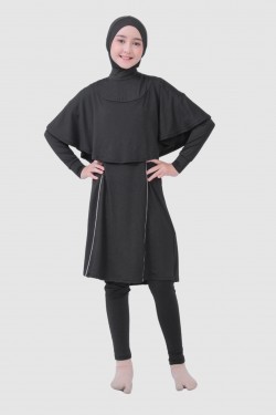 - Terdiri dari hijab yang dijahit menyatu dengan baju renang dan celana renang.