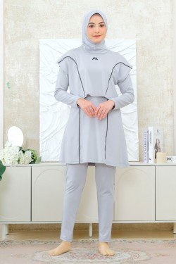 - Terdiri dari hijab yang dijahit menyatu dengan baju renang dan celana renang.