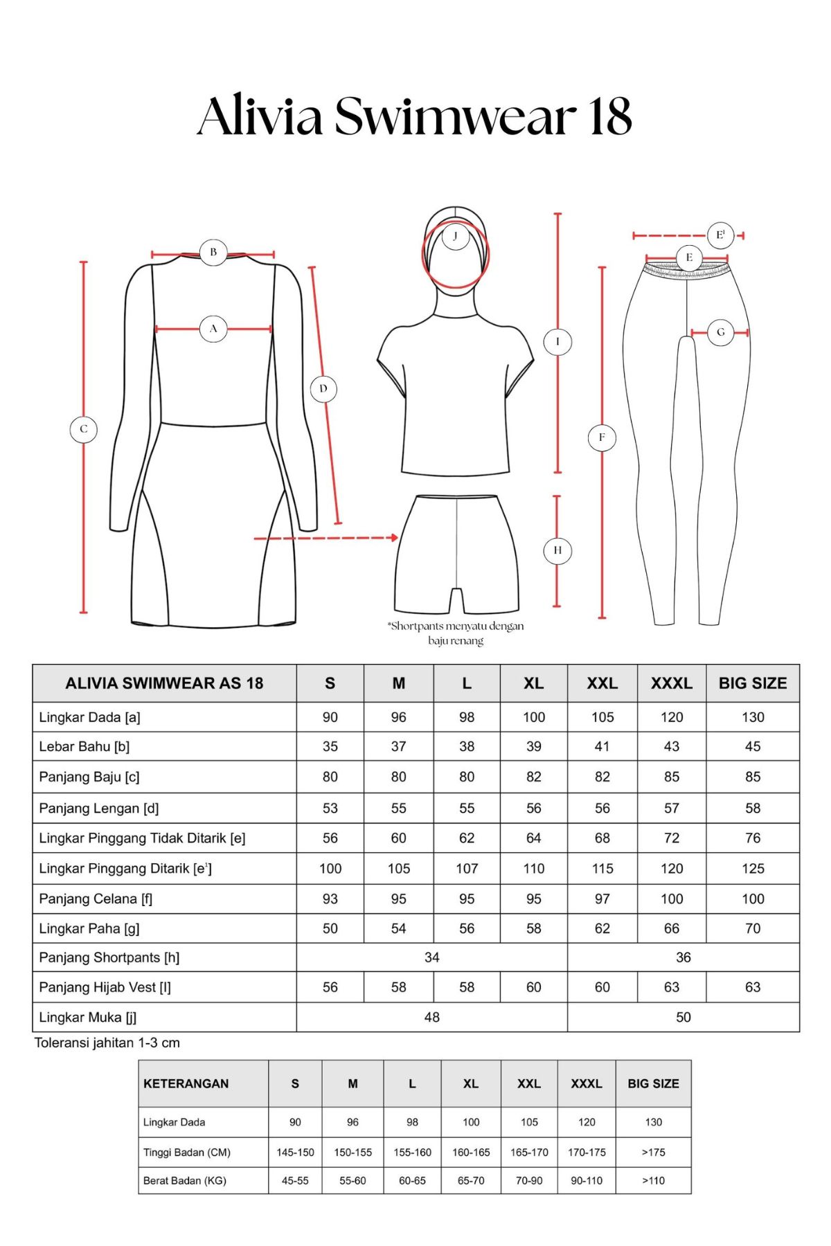 - Terdiri dari hijab yang dijahit menyatu dengan vest, baju renang yang menyatu dengan rok, dilengkapi dengan celana pendek/short pants dibagian dalam rok dan celana renang.